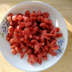 4. Put twice as much oil in the pot as usual for cooking, turn off the heat Over medium-low heat, add the red sausage.Do not stir-fry yet.Start stir-frying when some of the red sausage changes color slightly.