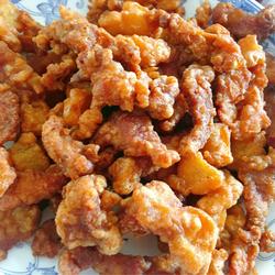 4. Pour more oil into the hot pot ( Rapeseed oil is the best and tastes better).When it is 60% hot, put the head of a chopstick into the oil pan.When you see bubbles, pick up the meat strips and put them into the oil pan one by one.Keep the whole process small and medium.Fry until golden brown.When the crispy meat is set and fried until golden brown, pick it up one by one to control the oil, turn on high heat and continue to heat the oil, and fry again.This process should be fast so that the crispy meat can be evenly colored and crispy on the outside and tender on the inside.