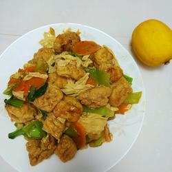 2. Heat the oil and stir-fry the chopped green onion, peppercorns and carrot slices until fragrant.Add the tofu and soak the rapeseed segments.Stir-fry for two minutes until the vegetables change color and become soft.Then add the yuba, oyster sauce, braised soy sauce, salt, and add water to cover the surface of the vegetables., simmer over high heat for a few minutes.When the soup is almost ready, add water and starch to reduce the juice and serve.