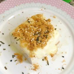 6. Take out the steamed tofu, pour a little soy sauce and sprinkle with golden seasoning