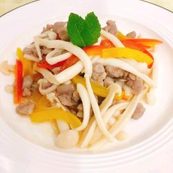1.Ingredients: 15g seafood mushrooms, 15g pork tenderloin, appropriate amount of bell pepper, appropriate amount of minced onion