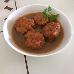 5. Heat the pot, add a little oil, add water, dark soy sauce, light soy sauce, oyster sauce to color, add meatballs, and bring to a boil Then simmer on low heat for 20 minutes, then add a little starch to thicken it before serving