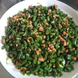 11.Add the chopped beans and meat and continue to stir-fry until the beans become soft, add in the middle A little water.