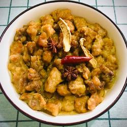 5. Heat the oil in the wok until the oil temperature rises to 70-80% When hot, add diced meat one by one and fry until golden brown, charred on the outside and tender on the inside.