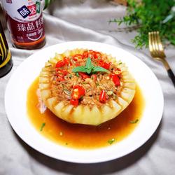 9.Put it into a plate, then put the spicy millet, onion, ginger and garlic on top of the winter melon cup