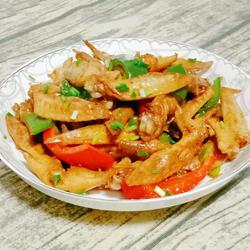 13. Wait until the tips of the chicken wings are cooked Pour in green and red pepper after clearing