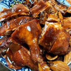 5.Add Huadiao wine, light soy sauce, a little salt, oil, onion, ginger, garlic, shredded tangerine peel and a large bowl of water, cover and simmer for 50 Minutes, turn over halfway