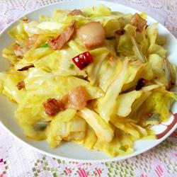 7.Pour in the torn cabbage and stir-fry over high heat