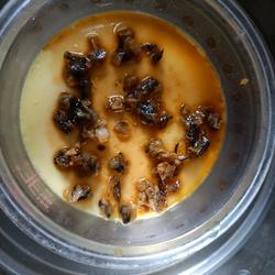 5.Pour the fried oysters on the steamed eggs, and add a small spoonful of deep-sea fish soy sauce to the cake