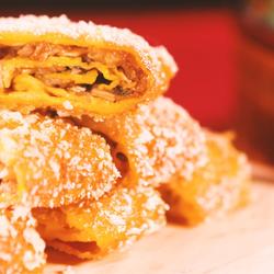 5.Add starch into the egg liquid, spread it on the egg skin, add mushrooms and winter bamboo shoots, and wrap the duck stuffing into a cylindrical shape;