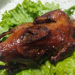 5.Take out the squab, apply honey, put it in the oven, bake at 220 degrees for 25 minutes