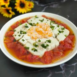 8. Mix the carrot and shrimp paste and put it in the middle of the tofu.Place the tomato cubes around the tofu.Add salt, June fresh white soy sauce, and a little black pepper.Sprinkle A little green onion, sprinkle with some oil