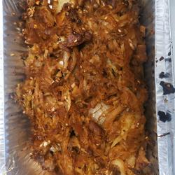 6. Place a layer of pork belly on the sauerkraut brushed with garlic juice piece.
