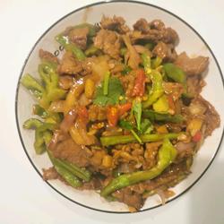 7. Heat the pan and add oil.Add the ginger, garlic, onion and green pepper and stir-fry until fragrant.Add the beef slices, add a little oyster sauce and sugar and continue to stir-fry for half a minute.Add the green pepper and stir-fry for half a minute.Serve out.