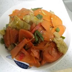 3.Add carrots and sauté over medium heat for 3 minutes.Add salt and MSG and sauté for one minute.Then add half a bowl of water and simmer over high heat for about 5 minutes until the carrots become soft