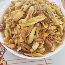 7.Introduce shredded pork, stir-fry until color changes, add rice beans, stir-fry.