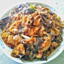 8. Put the fungus Stir-fry the green onions until raw, add the prepared sauce and stir-fry until the sauce is firm, then remove from the pan and serve on a plate.