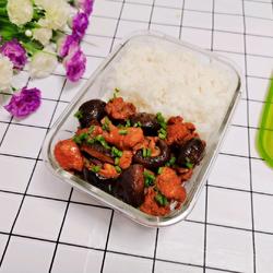 16.Put the rice and mushroom chicken into the lunch box, sprinkle some chopped green onion, and the mushroom chicken bento is ready.