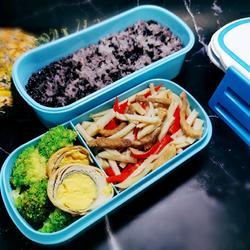 Stir-fried shredded pork with lotus root and two-color rice bento Recipe