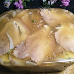 5. Put seafood soy sauce into the cooked pork skin jelly to adjust the color, and salt Appropriate amount, I don't like the flavor of MSG, but you can add it if you like it.Slice the elbows and put them in a layer in the box, then pour in the frozen pork rind soup (without the pork rinds) and add a layer of chopped green onion.