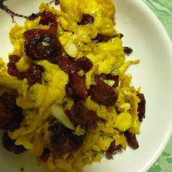 6. Fry the eggs until cooked and scattered, add the cooked sausage slices and garlic slices, stir-fry evenly.