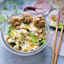 12.Pour the egg fried rice into a bento bowl and add three meatballs.The delicious meatball and egg fried rice bento is completed.