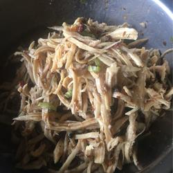 7.Add salt, sugar, diluted sesame paste, light soy sauce, ingredients from step 6 to the shredded chicken, add some sesame oil, and stir thoroughly