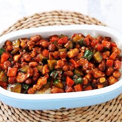 3. Cut cucumbers and carrots into cubes and dry them Cut the red pepper into sections and mince the onion, ginger and garlic