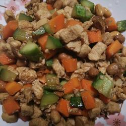 1. Chop chicken breast, cucumber and carrot into dices, and shred onions, ginger and garlic.