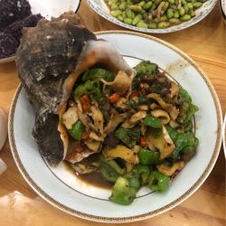 4. Add an appropriate amount of oil, heat it up, add onion, ginger and garlic and saute until fragrant, add Millet pepper, stir-fry for 10 seconds, add conch slices, stir-fry for 10 seconds, add cooking wine, light soy sauce, oyster sauce, steamed fish soy sauce, green pepper, salt, sugar, stir-fry evenly, and put on a plate! Fragrant