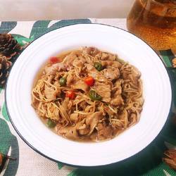5.Pour in the water-controlled enoki mushrooms and beef and stir-fry quickly.