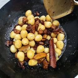 4. After frying until slightly yellow, add a few rock sugar and continue frying for a while.