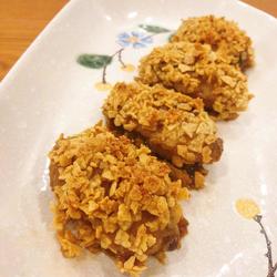 7. Then wrap it in a layer of egg liquid, and finally wrap it in crushed potato chips.