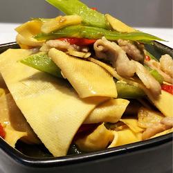 6.Add tofu skin and chili pepper and stir-fry evenly