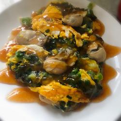5.Put oil in a non-stick pan.When the oil is hot, add the green garlic leaves and stir-fry until slightly wilted.Add the oyster meat and stir-fry until cooked.Add salt and mix thoroughly.