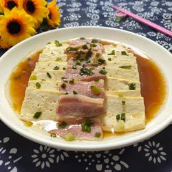 4.Pinch the sliced bacon into rice wine and put it on top of the old tofu