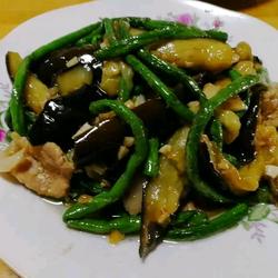 8. When the meat turns white, add minced garlic and saute until fragrant.Add oyster sauce and add eggplant.Add the light soy sauce and green beans to the pot and pour in.Add sugar, salt and MSG, stir-fry evenly, and serve on a plate.