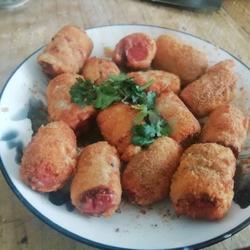 10.Pour oil into the pot.When the oil is 80% hot, put the wrapped small intestines in one by one p>