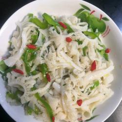 5. Heat oil in the pot, turn off the heat, add green pepper, chopped green onion, and sauté Let it cool down, then add tripe, chicken essence, salt, wild camellia oil, sesame oil, and mix well.