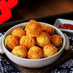 5.Take a quail egg , wrap a noodle around the quail egg, and wrap it around and around until the quail egg is completely wrapped in noodles.Press the tail of each noodle with another noodle.After wrapping the last noodle, wrap the tail Go around other noodles and press them tightly