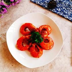7. Fry both sides, push the shrimp to one side of the pot, add tomato sauce, Fry the red oil over low heat.