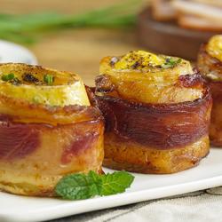 2. Place the potatoes on a baking sheet, wrap the outer layer with bacon, and bake in a preheated 200℃ oven 35 minutes to make
