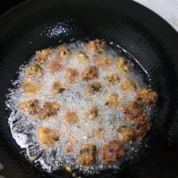 2.Put the oil on the fire, make the meatballs into round shapes, and fry them in the hot oil