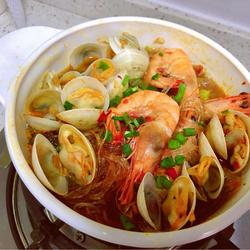 6. Drain the clams and shrimp, then pour them into the pot one by one and stir-fry quickly.