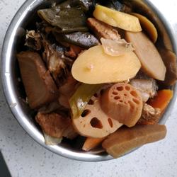 5.Put a layer of cabbage at the bottom, and then A layer of pickles (the pickles can be cut into smaller pieces), topped with pork belly, kelp, potatoes, and lotus root (my hands were too wet to take pictures while making them)