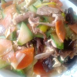 6.Pour in the scrambled eggs and cucumber and stir-fry together.
