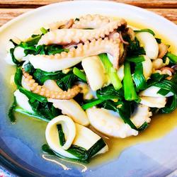 Blanched octopus can be kept crispy by placing it in ice water.You can also make stir-fried squid with leeks in the same way.