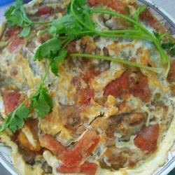 5. Add water to the sweet potato powder and wet it until it becomes granular.Add the oysters, garlic, tomatoes and lean meat and mix well