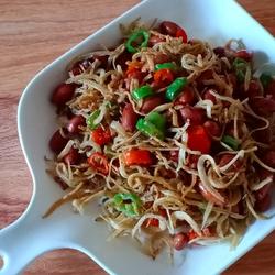 6. Fry the small whitebait until it turns yellow, add peanuts and green and red pepper