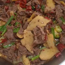 4.Fry the fresh beef marinated in light soy sauce until seven times mature, take it out and put it on a plate.Then add oil and stir-fry ginger, garlic, hot pot base ingredients, chili powder, stir-fry until fragrant, add water and bring to a boil.Pour in the fried beef and cook for five minutes.